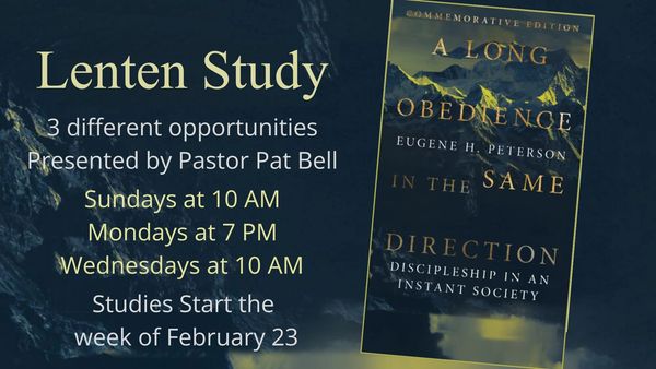The church-wide Lenten Study starts the week of February 22, 2026. Based on Eugene H. Peterson's book, “A Long Obedience in The Same Direction.” There will be 3 different opportunities to join the study presented by Pastor Pat Bell.